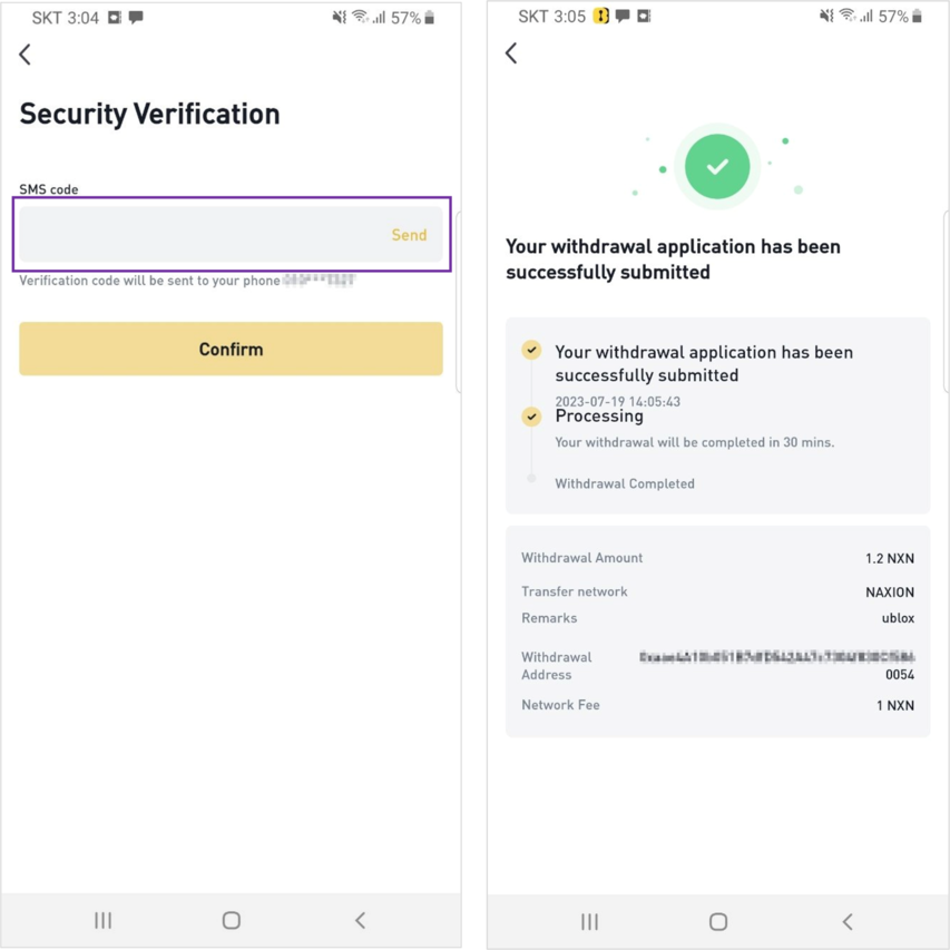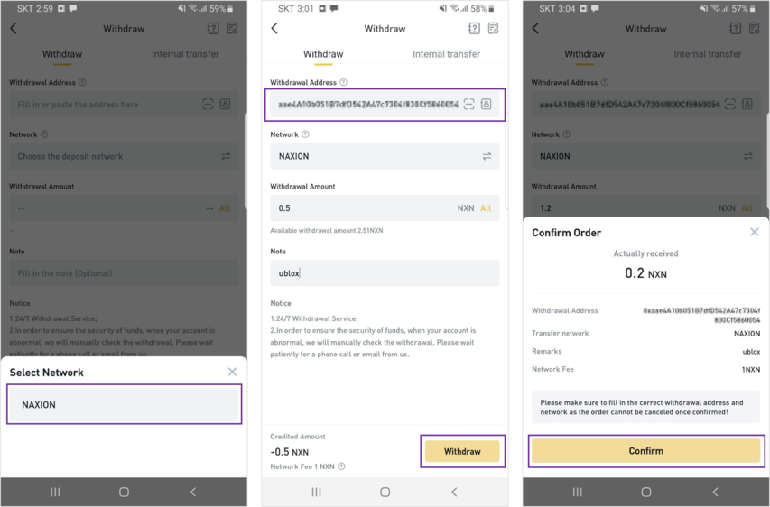 6️⃣ Enter the UBlox wallet address where you want to receive the NXN and the amount of NXN you wish to send, and then tap on 'Withdraw'